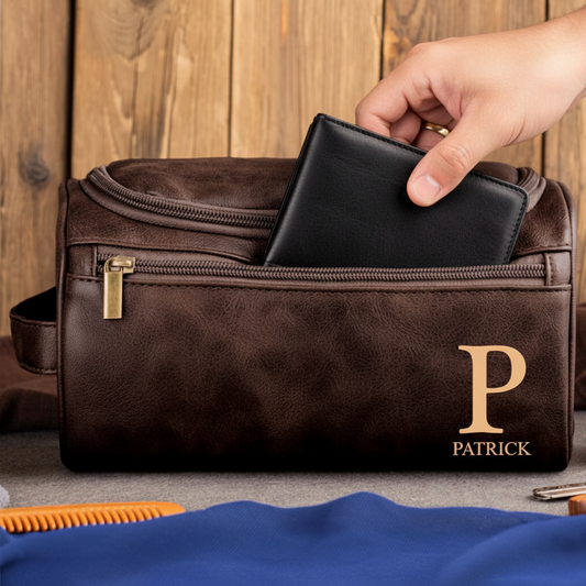 Vendor:Made It OneLuxury Leather Toiletry Bag with Laser Engraved Initial - Premium Personalized Gift For Dad, Husband