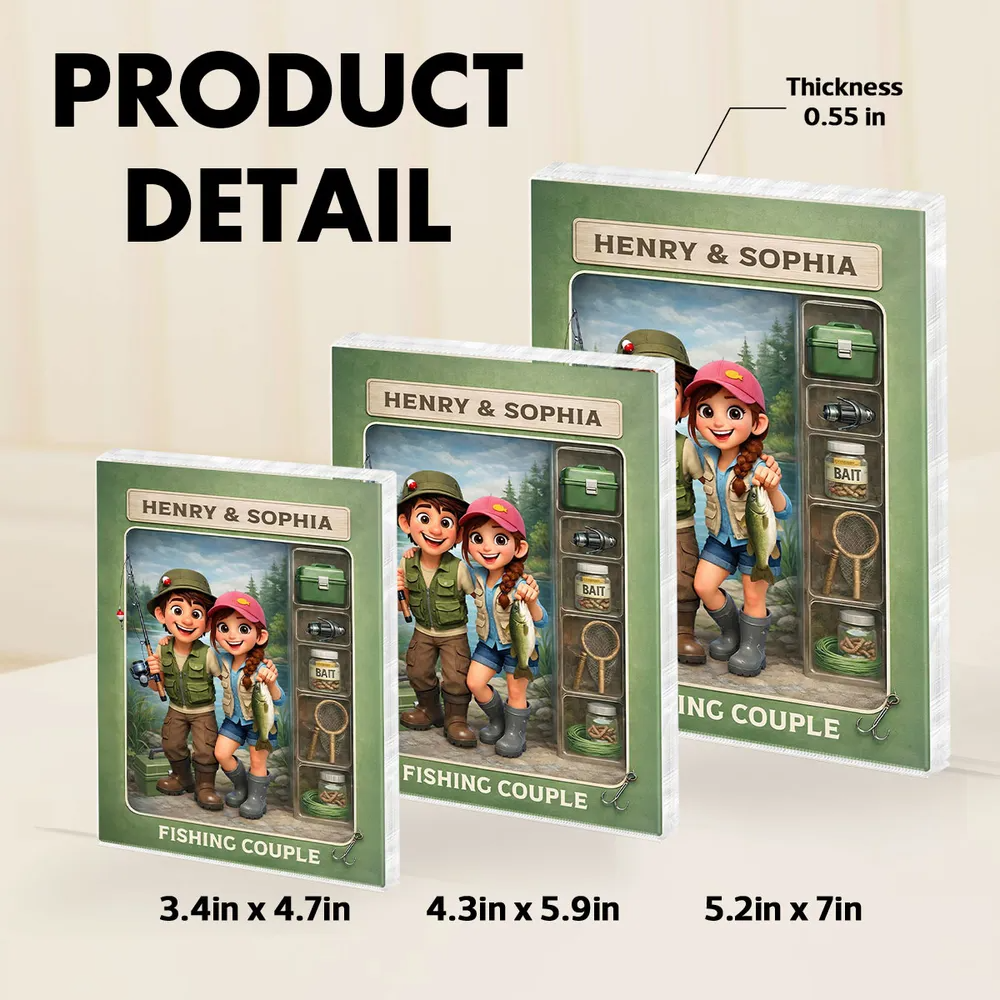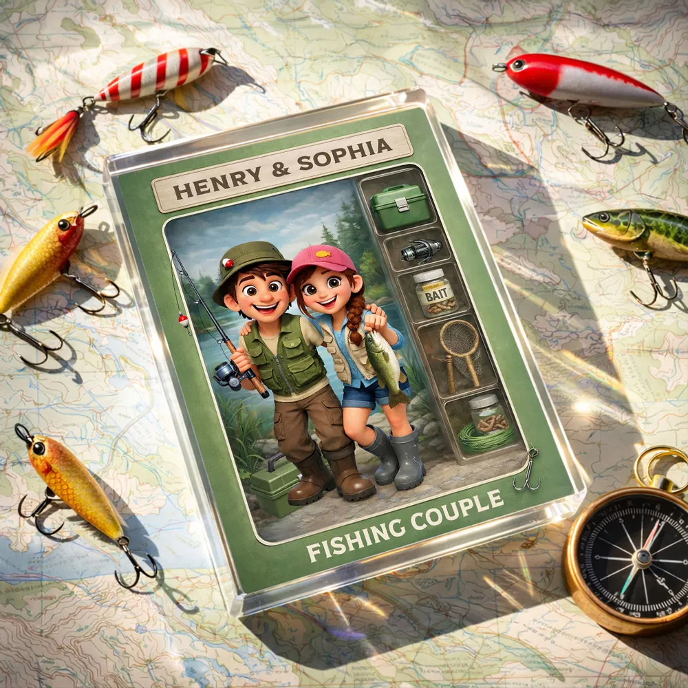 Celebrate a love that grows quietly, patiently, and genuinely with this personalized fishing couple acrylic block plaque. Inspired by the peaceful moments shared by the water, this charming action-figure–style design captures a couple enjoying a simple fishing day together—smiling, relaxed, and completely present. Custom couple appearance details, names, this keepsake turns an everyday hobby into a meaningful symbol of togetherness. Fishing here isn’t about the catch—it’s about slowing down, talking without pressure, waiting side by side, and enjoying the calm. This piece represents relationships built on ordinary moments that feel extraordinary when shared with the right person.