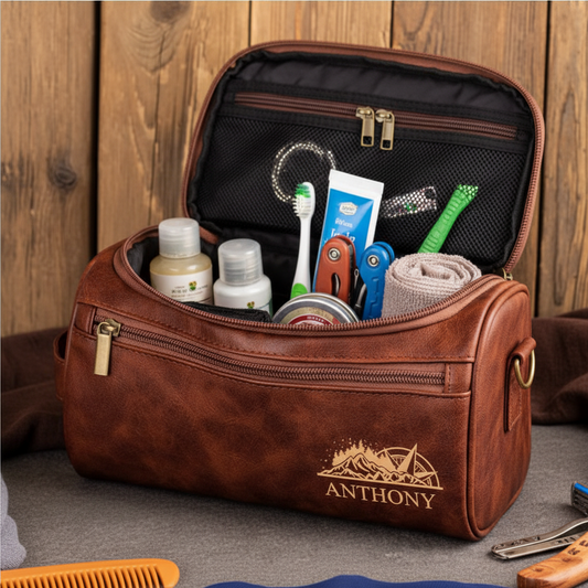 Custom Leather Toiletry Bag for Adventurers – Personalized Name & Mountain Design