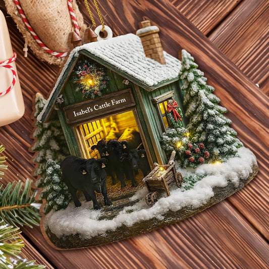 Personalized Farmhouse Christmas Barn and Cattle, Custom Wood Ornament, Gift For Farmers and Ranchers