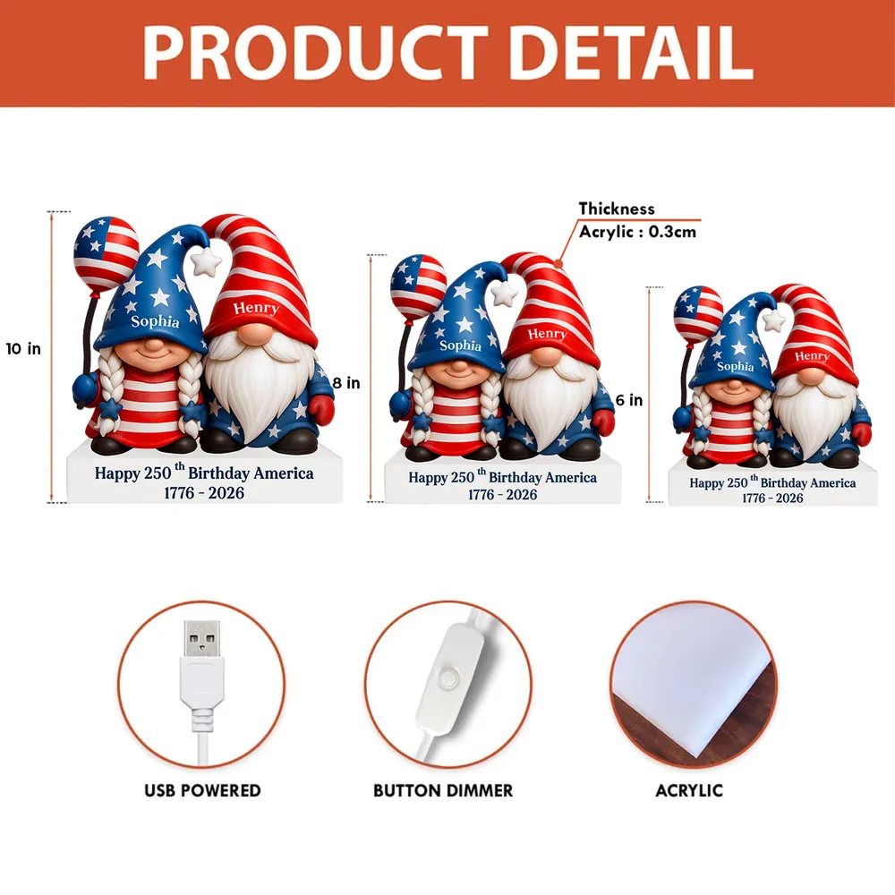 250th Anniversary American Gnome Couple - Personalized Light Box - Perfect Valentine Gift for Couple, for Her, for Him