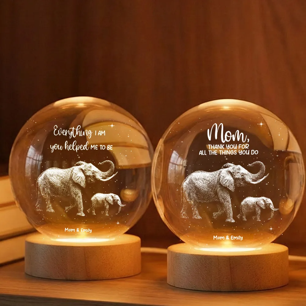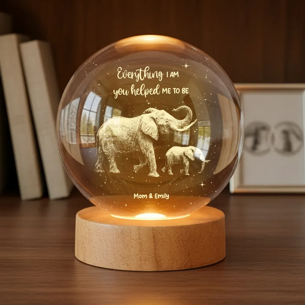 Celebrate the unconditional love and guidance of a mother with this deeply meaningful personalized crystal ball LED night light. Designed to instantly capture attention with its soft, celestial glow, the touching elephant and baby illustration symbolizes strength, wisdom, and a bond that lasts a lifetime. The heartfelt message creates emotional resonance, while personalization with names transforms this printed crystal-style keepsake into a powerful tribute—perfect for birthdays, Mother’s Day, or any moment you want to thank Mom for shaping who you are today.