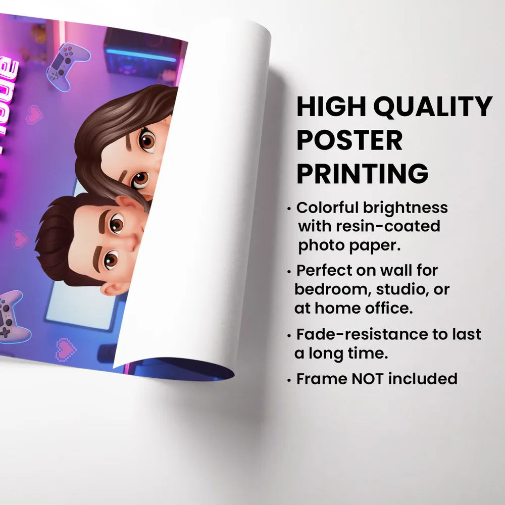 Level up your love story with this fun and heartfelt personalized gaming couple poster. Instantly eye-catching with its neon-inspired “Forever in 2 Player Mode” design, this artwork captures attention while celebrating shared adventures, late-night gaming sessions, and teamwork that goes beyond the screen. Customized with names, it turns a playful concept into a meaningful keepsake—sparking desire through personalization and emotion, and inviting you to celebrate your relationship with a décor piece that perfectly reflects your gamer bond. every lifetime.”