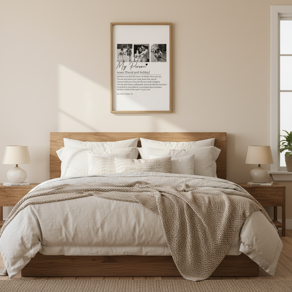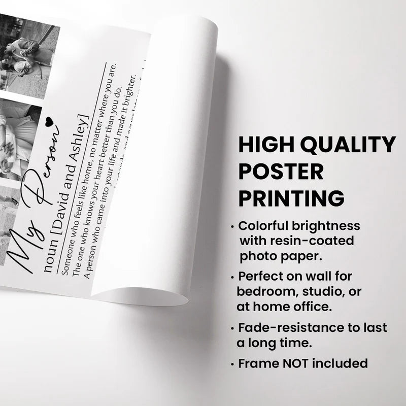 Simple, elegant, and deeply meaningful, this personalized “My Person” definition wall art turns love into words that last forever. Instantly captivating with its clean, modern design and photo-style layout, it draws you in with a heartfelt definition personalized with names and cherished memories. Printed with clarity and warmth, this poster beautifully expresses connection, comfort, and unconditional love—transforming your relationship into timeless décor. It’s a sentimental statement piece that speaks straight to the heart and invites your loved one to feel chosen, understood, and forever cherished.