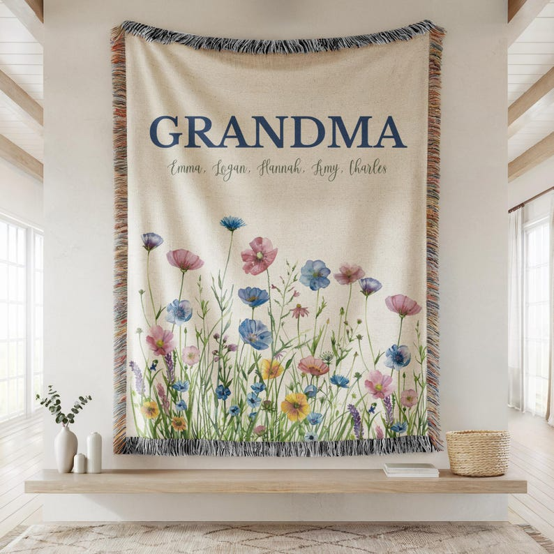 Wrap your loved ones in warmth and sentiment with our Soft Floral Custom Name Woven Blanket - a beautifully crafted personalized woven keepsake designed just for Grandma. Featuring delicate floral artwork and optional custom names, this personalized blanket brings comfort, love, and a touch of elegance to every moment. A thoughtful and timeless woven blanket gift that becomes a cherished reminder of family bonds.