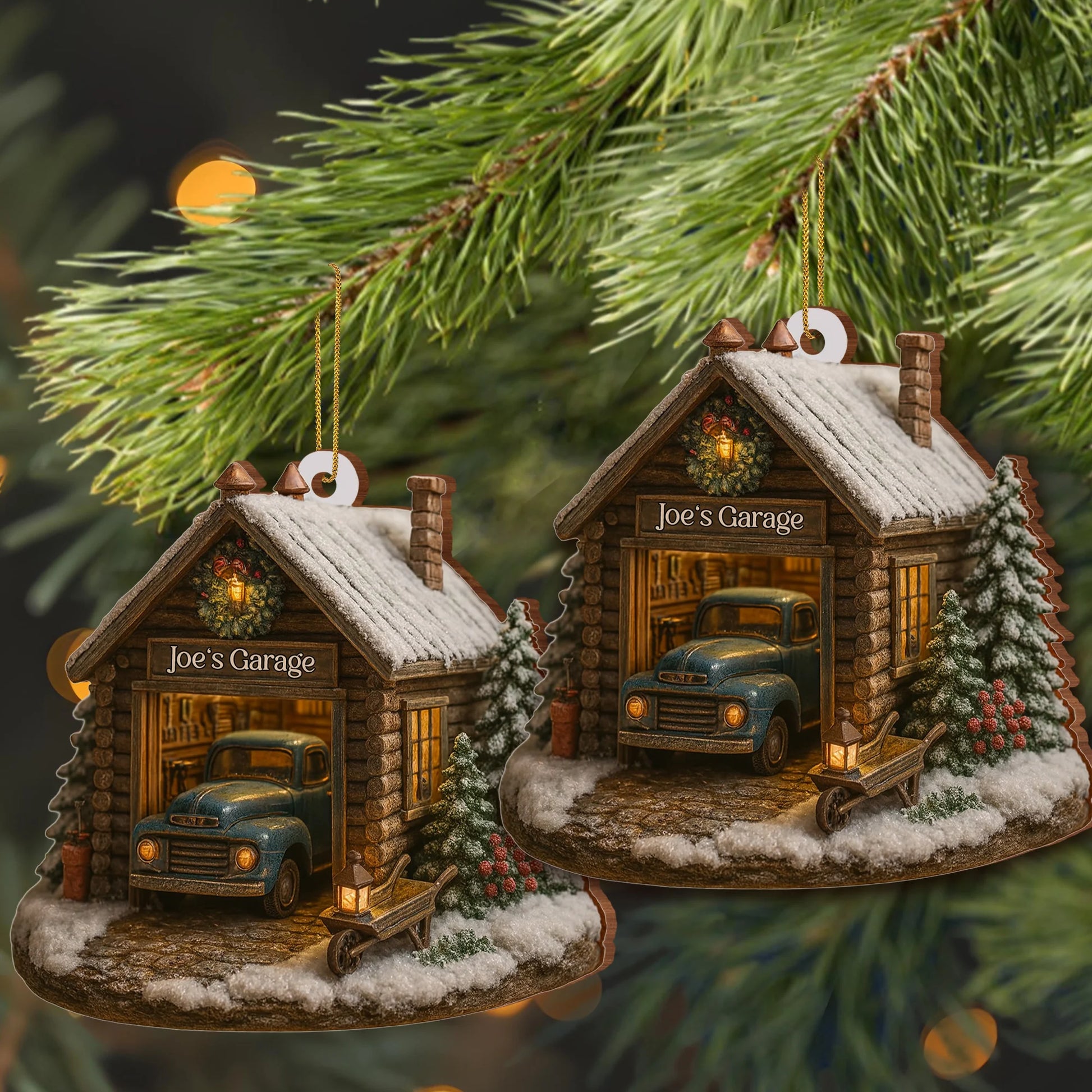 Welcome To Joe's Garage With Vintage Truck And Christmas Trees,Personalized Custom Wood Ornament,Gift For Car Lovers And Fathers